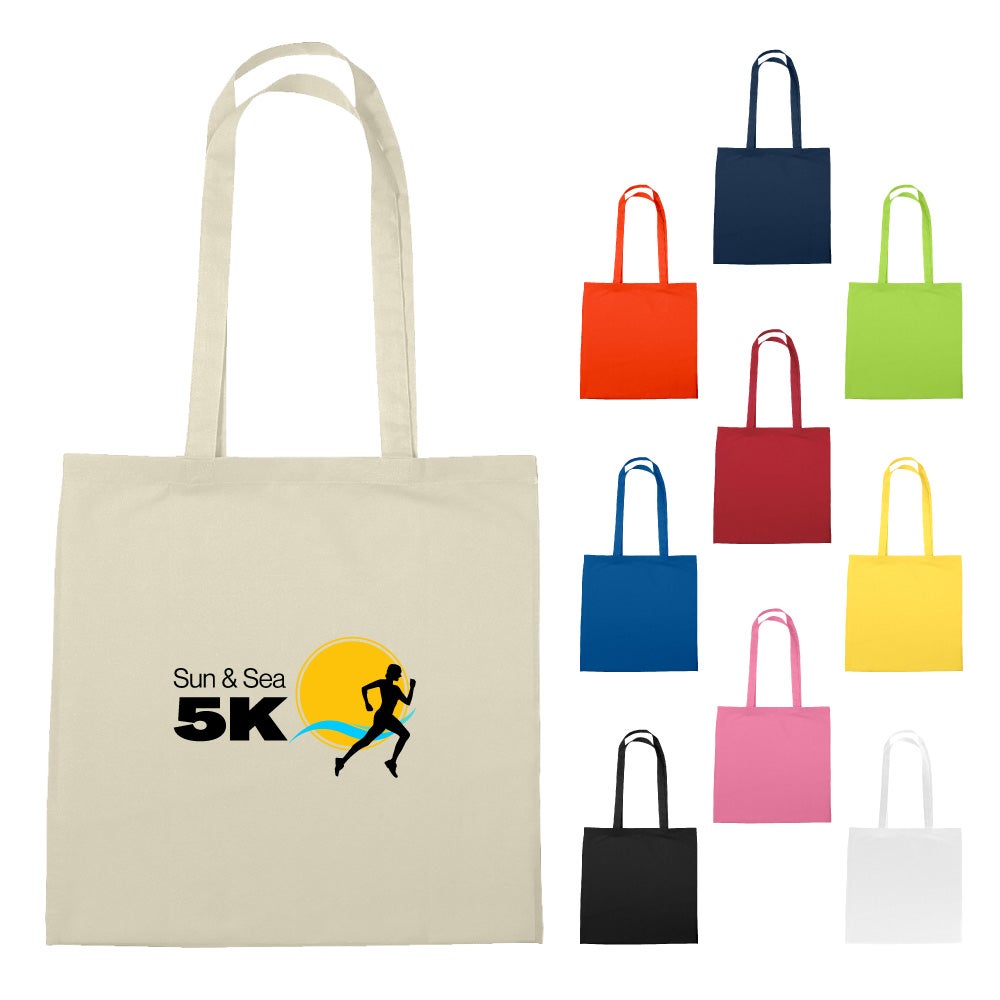 Lightweight custom tote bag is made of four ounce, 100% natural cotton. Budget-friendly tote bag has 30" handles. Spot clean and air dry. Eco-friendly cotton bag can be used for trade shows or as a gift bag.