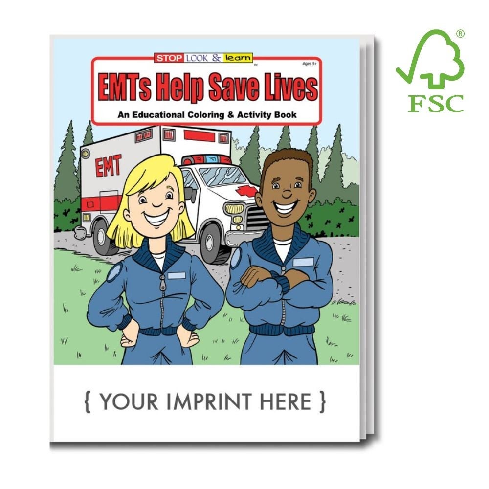Stop Look & Learn - FSC certified coloring book teaches children the importance of emergency repsonders! "EMT's Help Save Lives" is a 16-page educational coloring and activity book. Help children develop a positive attitude towards being every day heros and how the deliver life saving assistance. This book creates enthusiasm and teaches kids who helps in an emergency situation. Recommended for children 3 and up.Covers are printed on 50 pound white offset covers and text pages are printed on 30 pound bulky news.Printed with soy inks.Great giveaways for EMS, EMTs, police and fire stations, public safety awareness programs, and more!