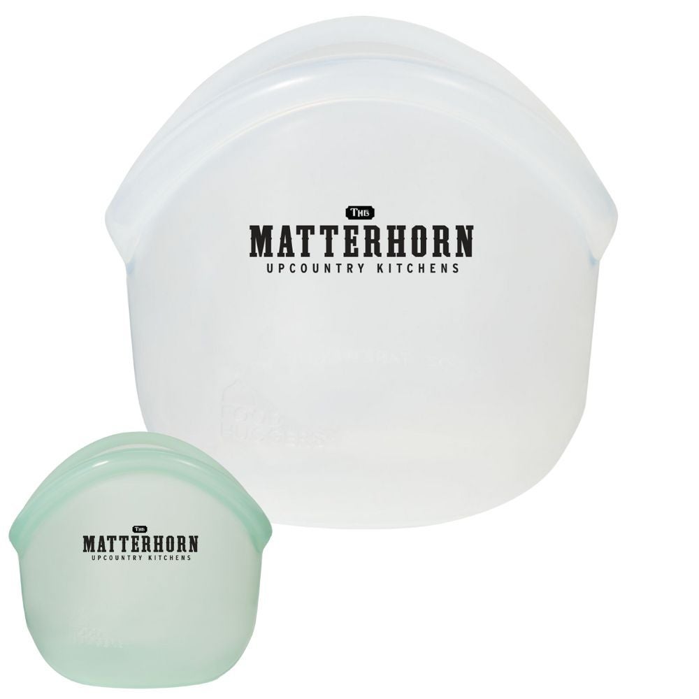 Custom Food Huggers Hugger food bag is made from durable and reusable silicone. Replaces the need for single-use plastic bags. Holds up to 13 oz of dry or liquid contents and stands up and stays open for easy filling or snacking. Zip closed and put in your fridge, pantry, bag, or car so you can store or snack anywhere. Features tare weight on bag. Silicone food bags folds flat for easy storage. Hand wash this sustainable swag bag recommended for longevity of the imprint. Dishwasher, microwave, and oven safe up to 392 degrees Fahrenheit. Meets FDA requirements, BPA, lead & phthalate free. As for the end-of-life cycle, silicone can be recycled but only at a specific plant. We have a resource partner, ECO USA, that takes those products, heats them up, and puts them through a filtration and refinement process to produce recycle-grade silicone fluid which can then be reused by other companies.