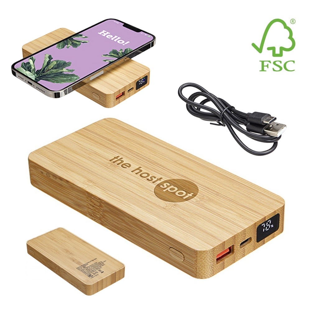 <p>Wireless charging power bank is made from natural bamboo material, is FCC certified and has Qi-equivalent compatibility. This battery packhas a 10,000 mAh Lithium Polymer battery with a dual USBoutput. Both of the outputs are 5V/3A perfect for charging smartphones with a 10W wireless output. Features power level indicator lightsto show how much power isleft in the power bank, foreign object detection and NTC temperature sensing to keep the battery in optimal condition. Includes a USB-C connection cable which can charge the battery backup or be used to charge up devices with a USB-C input. FSC-certified bamboois the fastest growing plant in the world and is natures most sustainable and renewable resource.Because bamboo is made up of inconsistent layers of material, variations of some logos may occur when laser engraving.<strong>Please note that bamboo patterns will vary or be inconsistent with each piece being unique.</strong></p><ul><li>Rechargeable</li><li>Renewable Resource</li><li>Energy Efficient</li><li><a href="https://ecopromotionsonline.com/tools/education-and-vocabulary">FCCCert… Certified</li><li><a href="https://ecopromotionsonline.com/tools/education-and-vocabulary">UL Certified</a>&MSDS</li><li>UN38.3</li><li><a href="https://ecopromotionsonline.com/tools/education-and-vocabulary">Prop. 65 Compliant</a></li><li>Eco-friendly Promo </li><li>Sustainable Promo</li></ul>