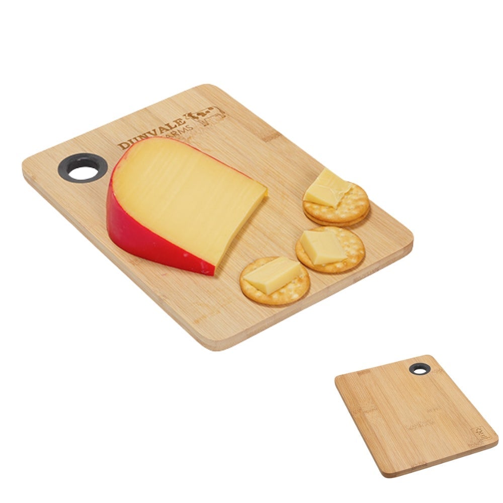 Custom cutting board is FSC certified, and made from 100% sustainable bamboo. Makes kitchen tasks easier cutting board is knife-friendly, easy to clean, and easy to maintain due to its natural antibacterial properties. Features a silicone thumb ring for convenient hanging. With its durability and natural bamboo beauty, this cutting board will become a staple in your kitchen that you'll enjoy for years to come. Customize with laser engraving to show off your company's brand. Hand wash only. Please note that bamboo patterns will be inconsistent with each piece being unique.