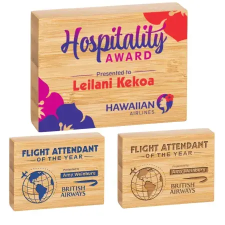 Elevate your next award ceremony with our sustainable bamboo freestanding awards. Made from renewable and FSC certified bamboo this sleek rectangle award merges nature with modern style and innovation. Personalize with your logo and recipients names. Custom one of a kind bamboo awards are great for schools, offices or any awards ceremony. Please note that bamboo patterns will be inconsistent with each piece being unique.