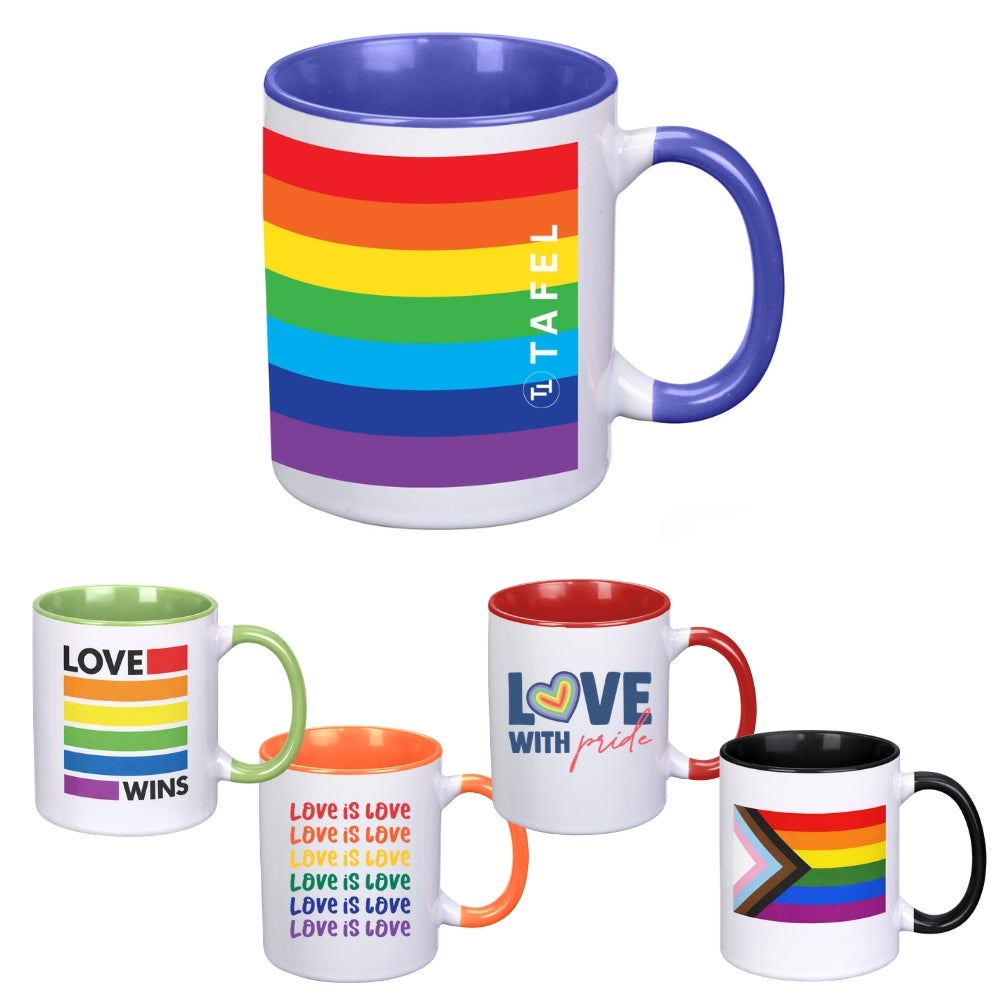 Show your pride with this simple, everyday essential designed to make a lasting impression. The white ceramic mug pairs a clean exterior with a glossy interior and matching handle accent for a pop of color. Available in five vibrant options, it offers a versatile way to align your brand with thoughtful, practical use. The large 4-color process wrap imprint creates full-coverage visibility for your message, turning each cup of coffee or tea into a meaningful touchpoint. Hand wash is recommended to preserve the design. Examples of stock art available are shown (rainbow, LGBTQ+ flag, Love is Love, Love Wins, and Love with Pride), making customization easy. Create your own art or reach out to our sales team for more ideas. A reusable choice that supports more mindful consumption, this mug helps extend the life of your brand while reducing reliance on single-use drinkware.