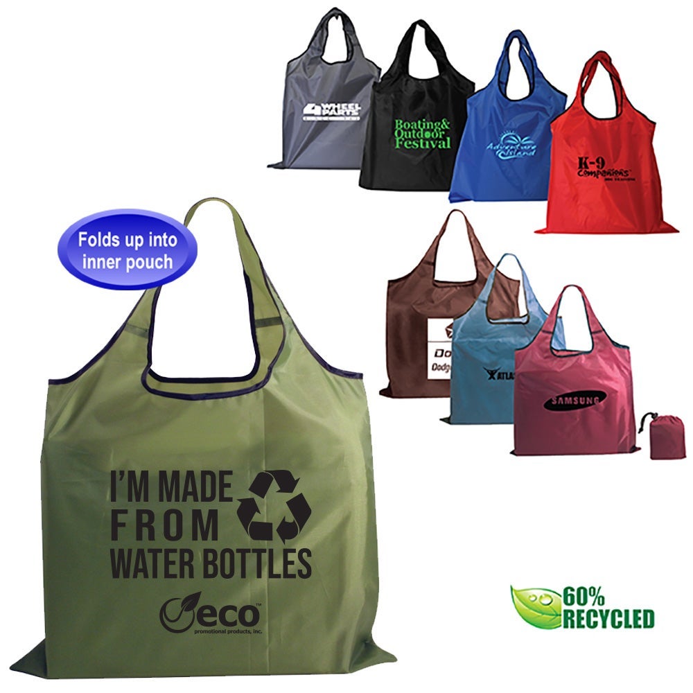 This popular recycled foldaway tote bag is available at a very affordable price. Our recycled foldaway shopping bag is made from 192 denier, made from up to 60% recycled post consumer PET (recycled water bottles) and has a sewn in 4" x 5" pouch with rope closure. 13" straps. Max. weight recommendation: 30 lbs. Spot clean recommended.