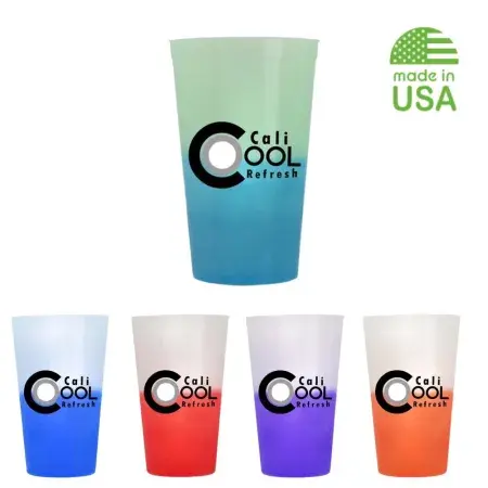 Made in USA, reusable stadium cups replace the need for single use plastic cups. Add Ice Cold Liquid and watch the Color Change right before your eyes! A fun reusable cup for on-the-go! Great for outdoor events, fundraisers, school branding, and more. Molded with 30% post-industrial "home" recycled material. BPA-Free, made of Polypropylene - Recycle Code #5. Top Rack Dishwasher Safe / Do Not Microwave.