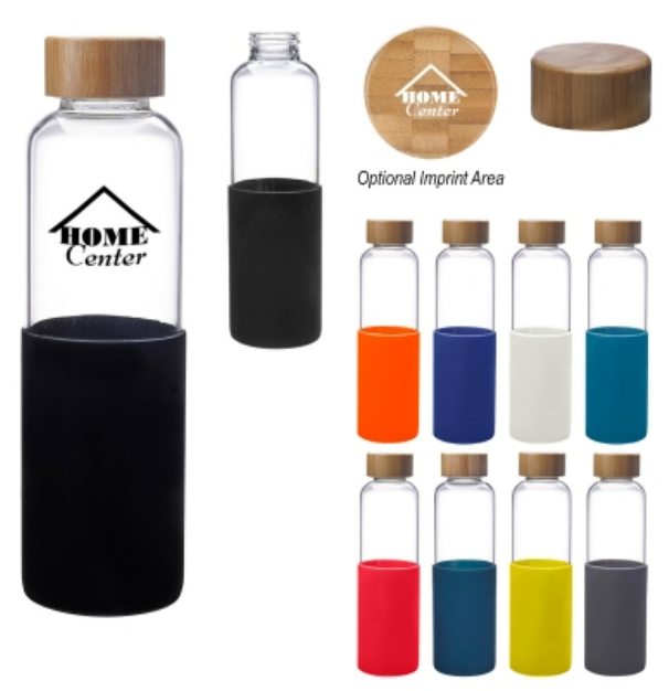 <p>This customizable 20 oz glass water bottle is made of high borosilicate glass with a silicone sleeve. Features a screw-on bamboo, spill-resistant lid with a wide mouth opening. Meets FDA requirements. BPA free. Hand wash recommended. Not for hot liquid use.This is a long-lasting, eco-friendly promotional item.<strong>Please note that wood grain patterns will be inconsistent with each piece being unique.</strong></p><ul><li>Reusable</li><li>Recyclable (Glass)</li><li>BPA free</li><li><a href="https://ecopromotionsonline.com/tools/education-and-vocabulary">Prop. 65 Compliant</a></li><li>Sustainable Promotional Product</li></ul>