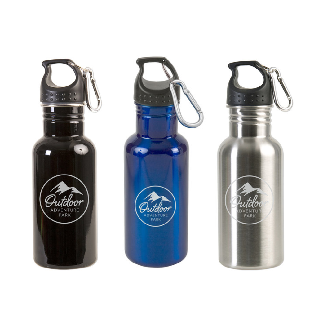 This stainless steel water bottle isBPA free. It features a wide mouth opening and a leak-proof screw-down lid with mini metal carabiner attached. Not microwave or dishwasher safe.Stainless steel is a very "clean" product and in many places recyclable. Help be waste-free by using your next new resuable water bottle.