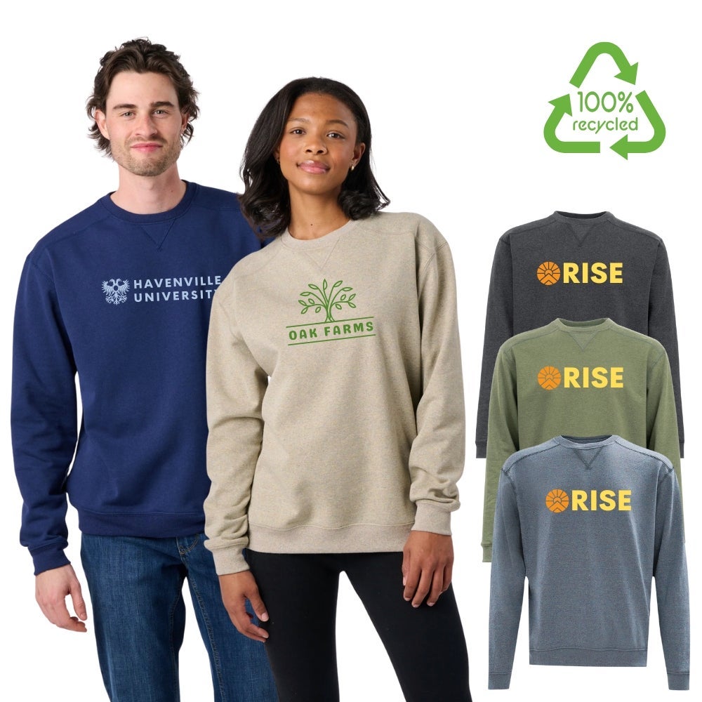 The Recover Crewneck Sweatshirt is a premium eco-friendly promotional product made from 100% recycled materials, blending 50% recycled cotton and 50% recycled polyester for lasting comfort and durability. This 8 oz sweatshirt features a brushed fleece lining, retail fit, and ribbed knit cuffs and waistband. Double-needle stitching, shoulder-to-shoulder taping, back neck tape, and a half-moon neck label enhance structure and comfort, while a locker loop with a natural hangtag highlights the garment’s environmental story. A woven Recover logo pinch tag adds a subtle branded detail. Through 1% For The Planet, 1% of annual revenue is donated back to environmental programs, reinforcing a commitment to environmental impact.