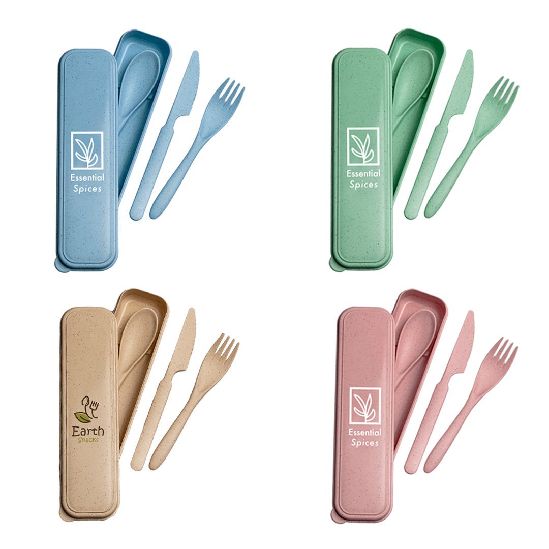 Eco-friendly travel cutlery set is made from 30% wheat straw which reduces the amount of plastic required to manufacture. Custom three piece set includes a fork, spoon and serrated knife that can be stored in the snap on storage box. Compact utensil set is great for kids, the office or any where you travel. Suitable for hot or cold liquids. Hand wash recommended. Dishwasher and microwave safe. A great, budget friendly sustainable promotional item.