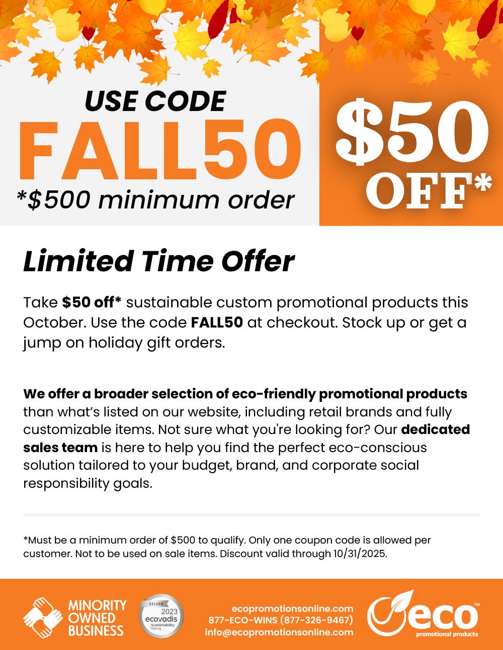Take $50 off* sustainable custom promotional products this October. Use the code FALL50 at checkout. Stock up or get a jump on holiday gift orders. Limited time offer.