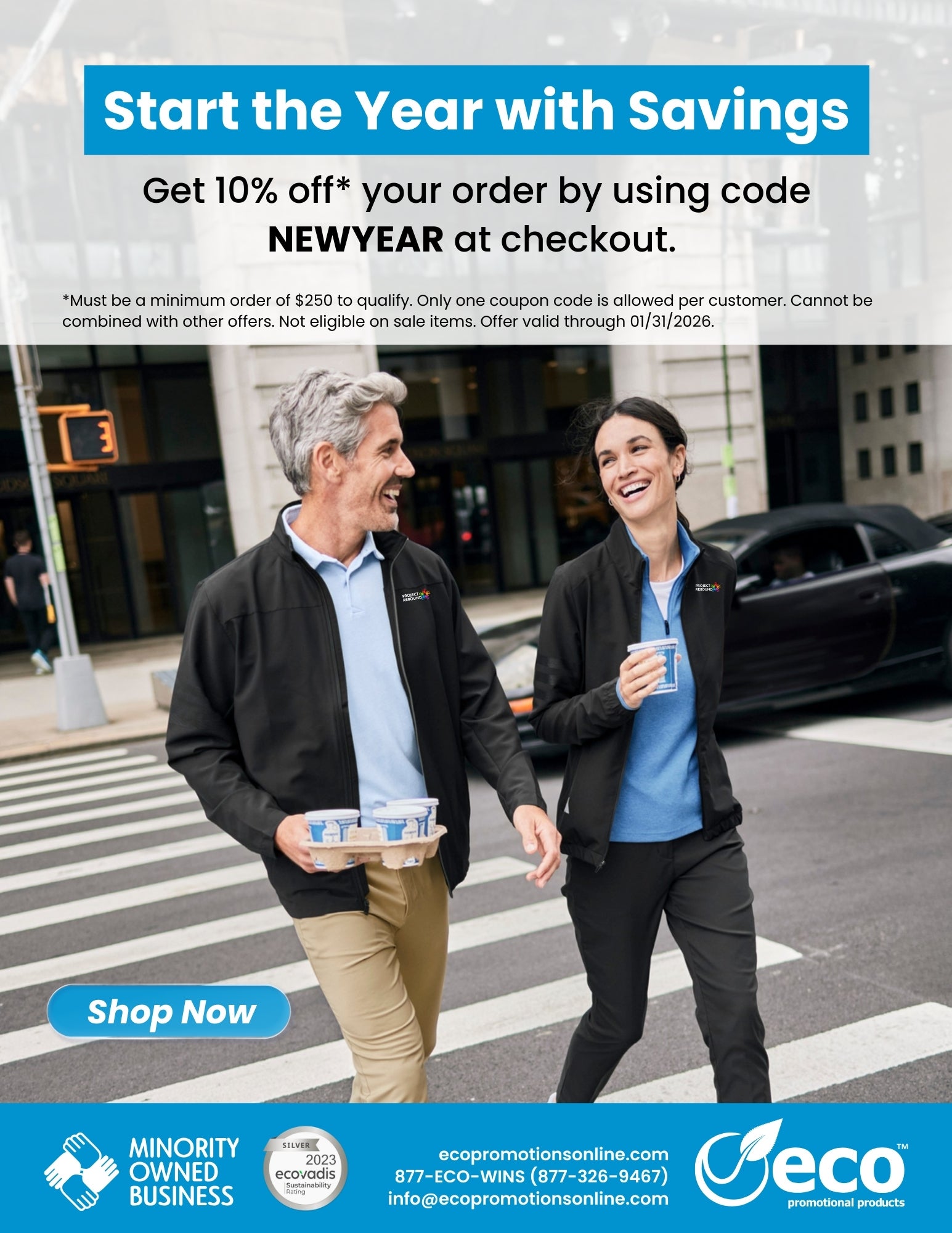 Limited Time Offer for January 2026: Get 10% off* your order by using coupon code NEWYEAR at checkout. This is the perfect opportunity to stock up on customizable eco-friendly products for upcoming conferences, corporate gifting, and other promotional events.