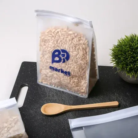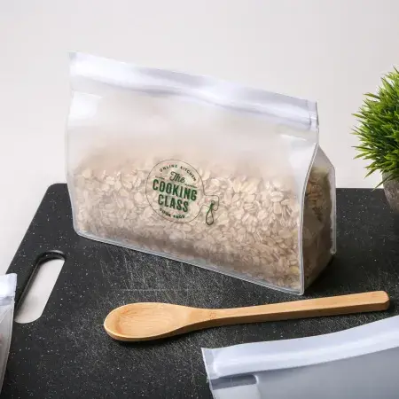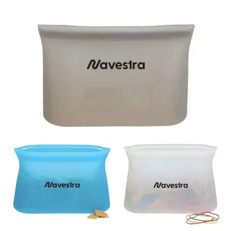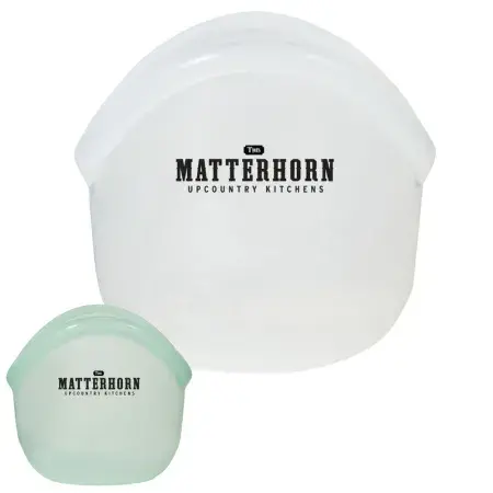 Reusable food bag with plastic slider is made from durable silicone. Holds up to four cups of dry or liquid contents and has a convenient loop for hanging. Hand wash recommended. Meets FDA Requirements. As for the end of life cycle, silicone can be recycled but only at a specific plant. We have a resource partner, ECO USA, that takes those products, heats them up, puts it through a filtration and refinement process to produce recycle-grade silicone fluid which can then be reused by other companies.